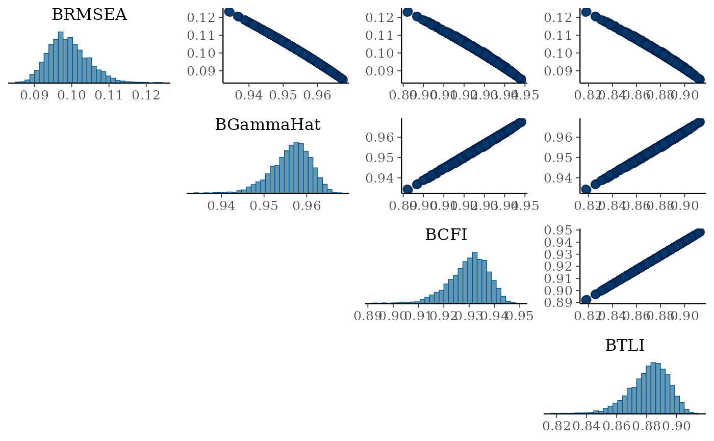 In SEM, one of the first steps is to evaluate the model’s global fit. This is commonly done by presenting multiple fit indices, with some of the most common being based on the model’s . We have developed Bayesian versions of these indices (Garnier-Villarreal and Jorgensen 2020) that can be computed with blavaan.