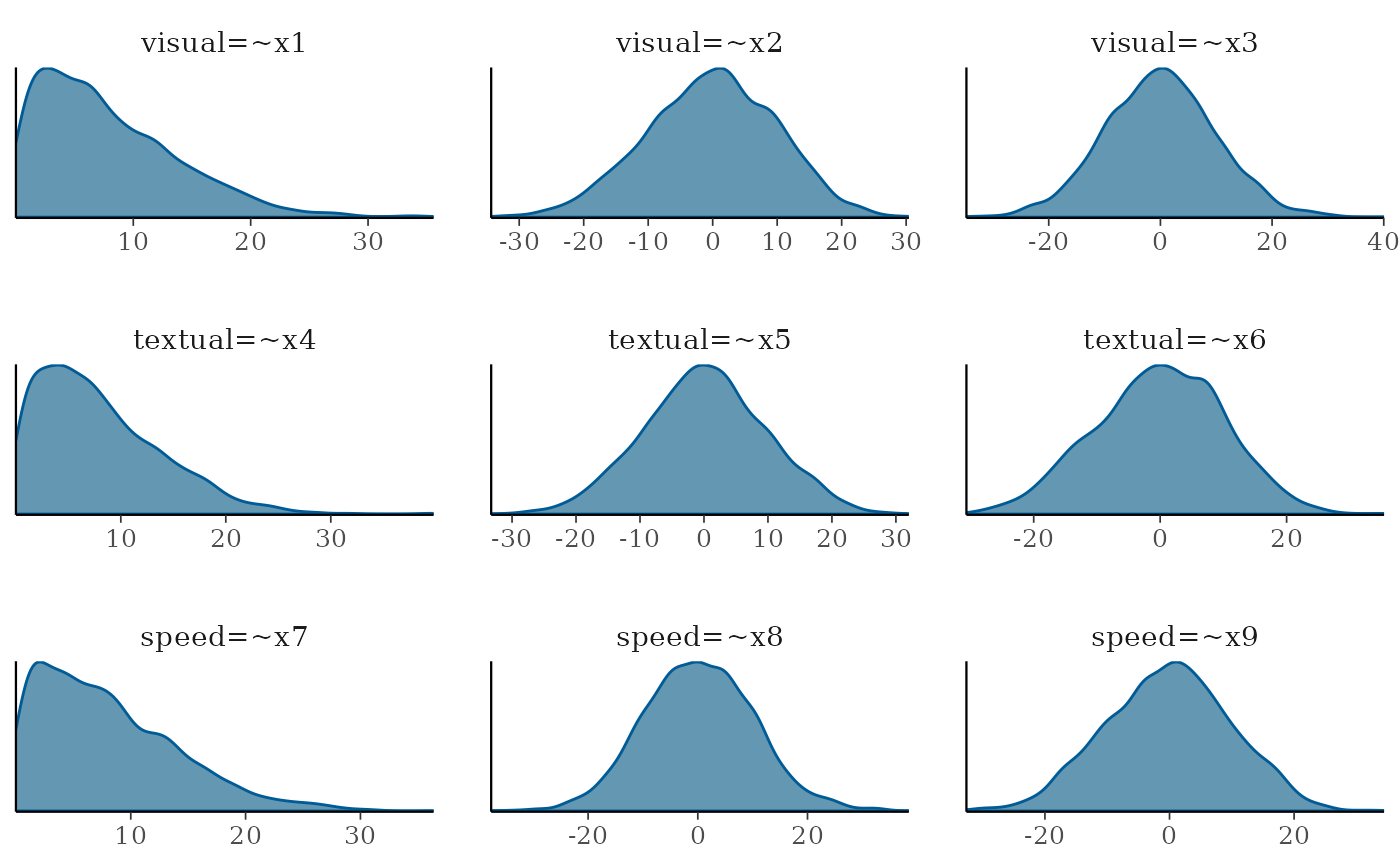 From the factor loading distributions we see that the first loading on each factor is bounded by 0, this is due to a modeling identification constraint in blavaan, and with a maximum value around 6. And for all other distributions they range between -6 to 6 or -4 to 4, and for all priors the most likely value is around 0. This would be described as weakly informative as it allows negative and positive values but without allowing crazy high/low values.